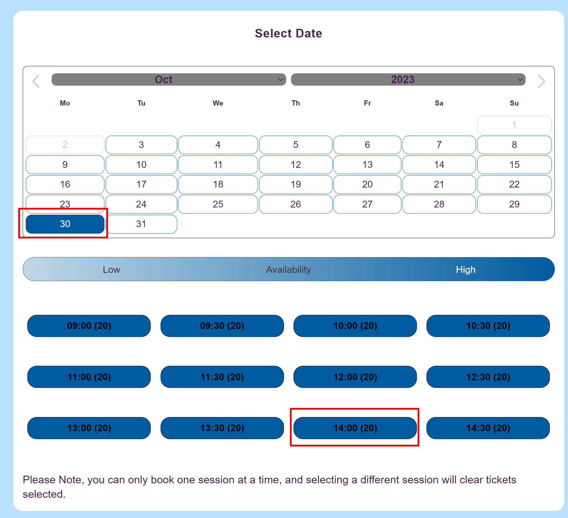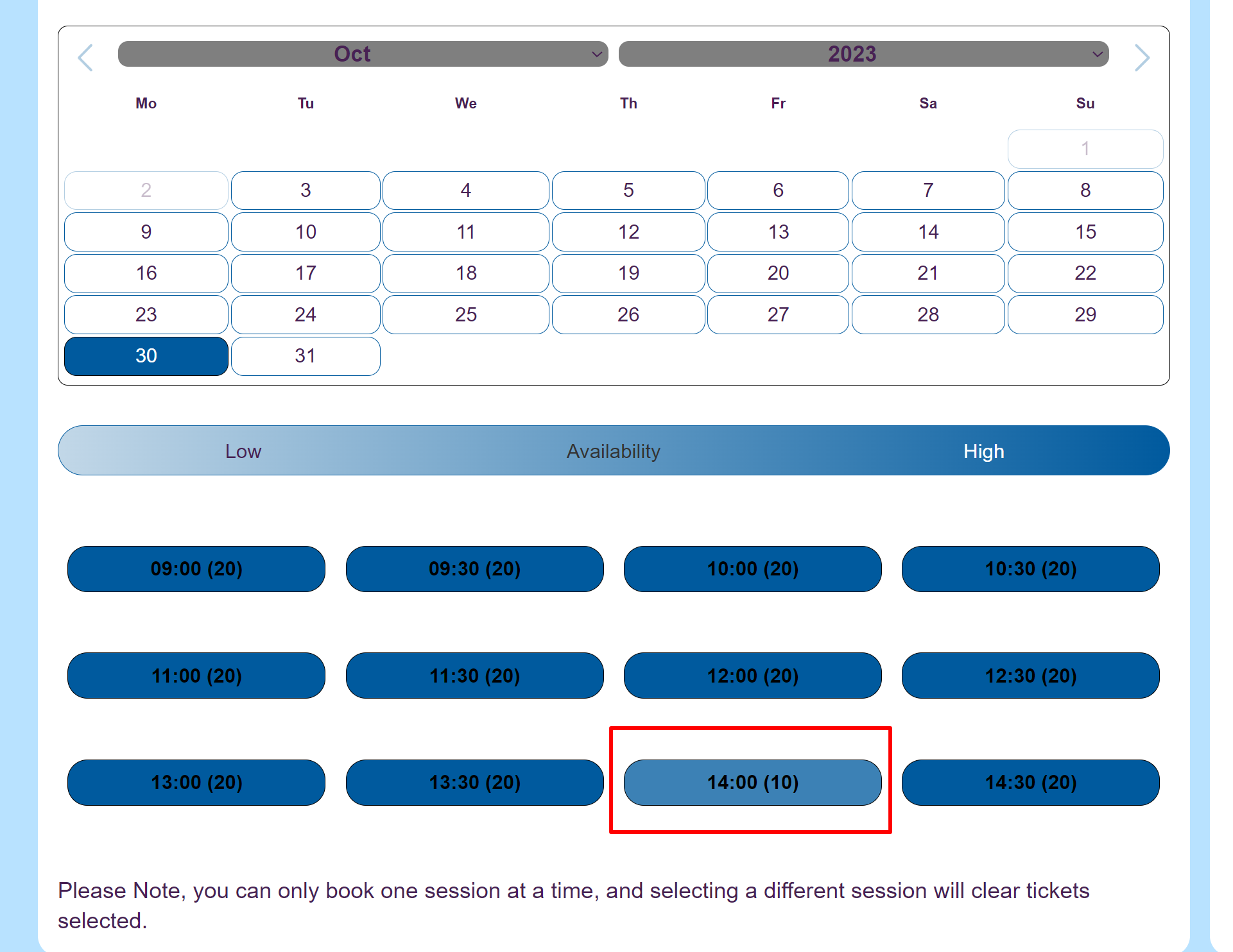 First, select the session for October 30th at 2:00 PM.