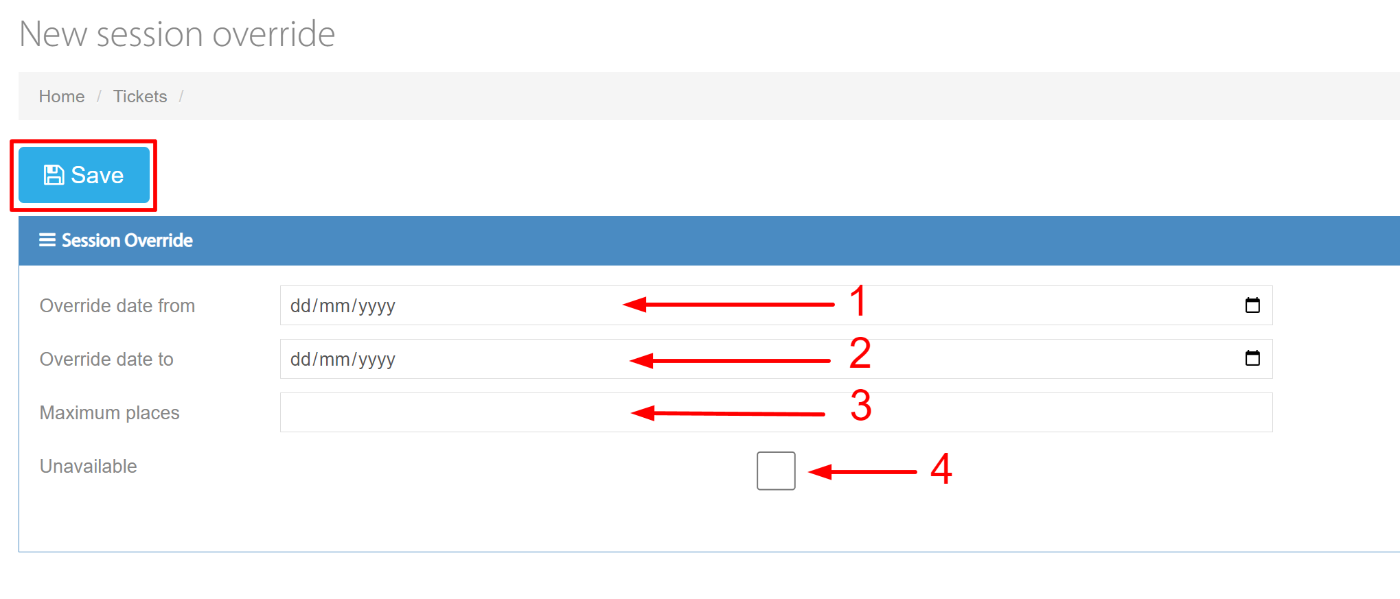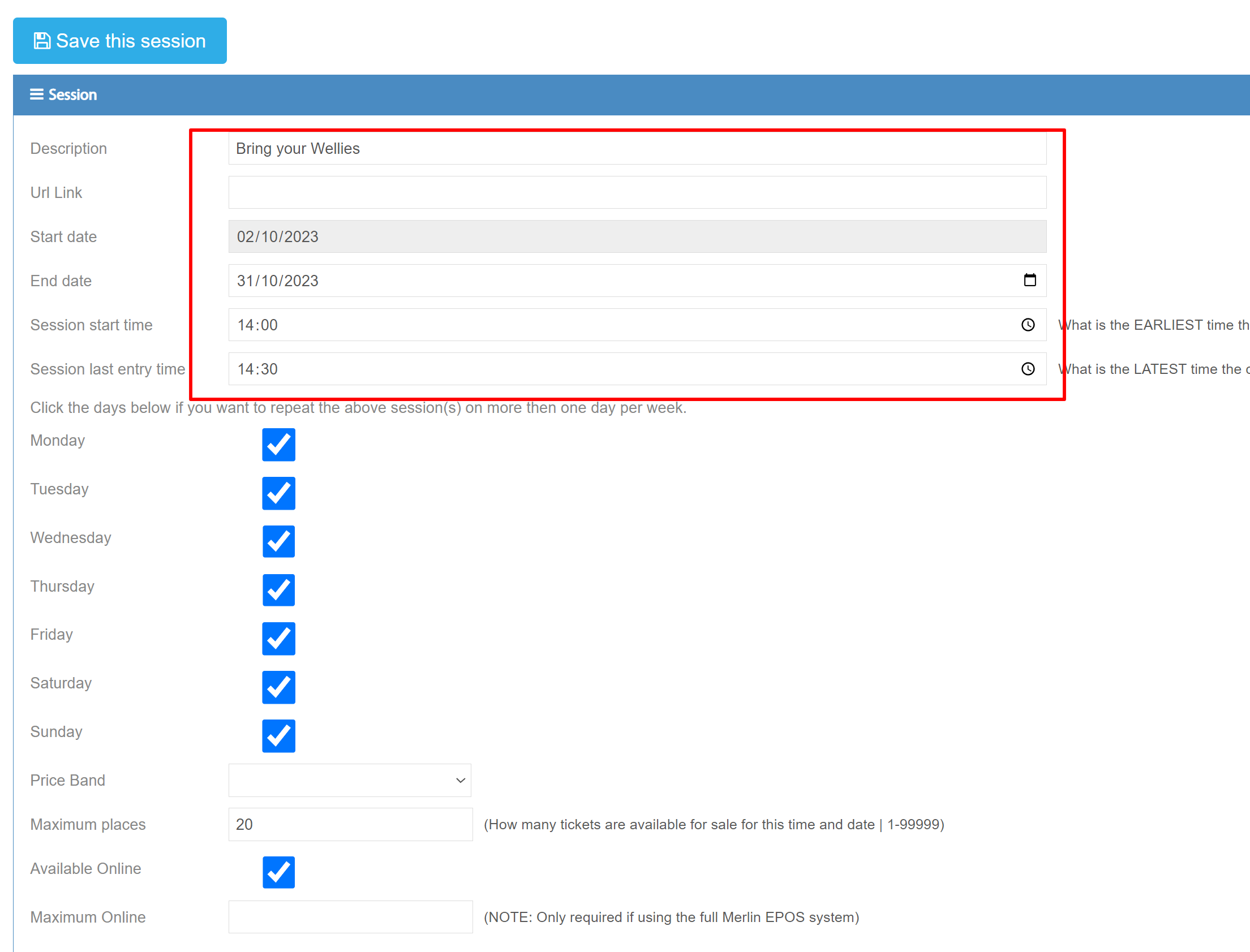 There are three fields that will need data. The checkbox is for, if you want to make that session unavailable.