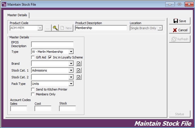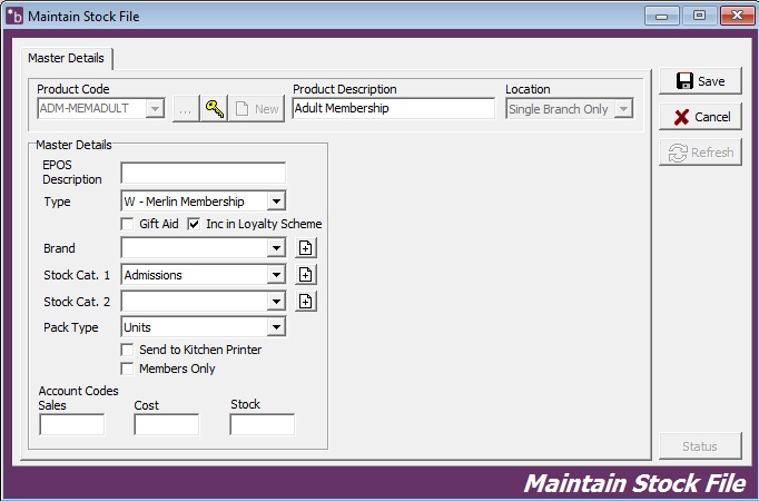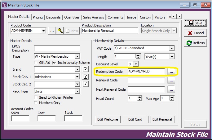 3. Click ‘Save’ on the right hand side. This redemption needs to be attached to the priced membership. In the ‘Product Code’ type in the membership (for e.g. ADM-MEMADULT). On the ‘Master Details’ tab there will be a ‘Redemption Code’ box on the left. Either type in the redemption code or click on the Ellipsis (…) and select it.