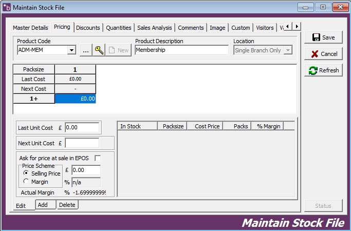 3. Type a code for a Membership in the ‘Product Code’ and click ‘New’. The rest of the boxes should be highlighted now. Fill in the details.