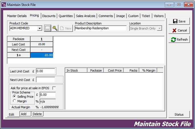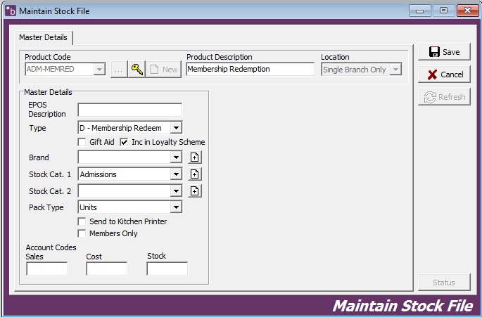 1. Type a code for the Redemption (for e.g. ADM-MEMRED) in the ‘Product Code’ and click ‘New’. The rest of the boxes should be highlighted now. Fill in the details.